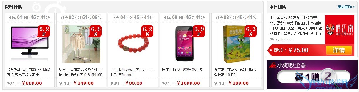 限时抢购:顾名思义,这些个产品的特价是限了时间的,过了时间就会涨价(至于到底会不会涨,咱不去深究,经常在淘宝买东西的童鞋应该很清楚这个),并且这个价格确实很便宜,至少比商店里便宜多了,并且每个产品上方都有一个时间表在不停的跳动,时刻提醒用户这个产品的折扣快结束了,请尽快下单哦!