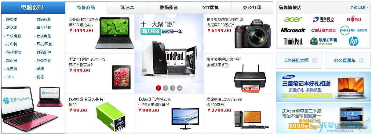 左边顶部展示大分类,电脑数码,其下面展示此类别下的各个小分类,底下再来一张广告图,这样的好处就是,文字清晰的说明了这一类别的大体类容,图片更加吸引眼球,毕竟现在做任何文章都讲求图文并茂,这样效果更佳,中间部位,特价商品,这个不用说了,图文并茂的一些热卖或者是主推的产品,价格用红色加粗显示,更加吸引眼球。