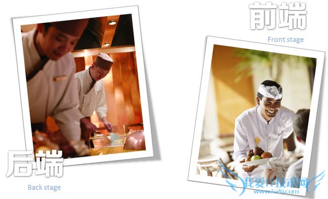 是为前端部分提供支持的背后后端的区分。如餐厅中,与用户接触的服务员是前端,而用户看不到的大厨是后端。