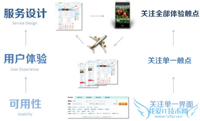 可用性关注单一界面,用户体验关注单一触点,而服务设计则是在两个维度上全面考虑产品与用户产生关系的所有触点:单一界面、单一触点的质量。比如一名用户,想在网上订机票,条件筛选等内容是单一界面层面的问题,一般通过可用性来评估,而预订机票所涉及的线上流程(预订页面、支付页面、订单页面)构成用户的一个触点,设计师需要评估并提升这个触点的用户体验。