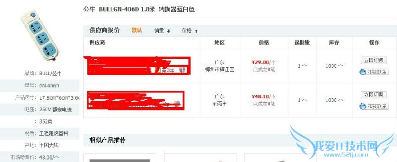 上图是“公牛BULLGN-406D 1.8米转换器蓝白色”的产品,可以很清楚的看出,同一个型号,一个省市,同一个产品,竟然报价差了19元,如果是你,你会选择那一个呢?