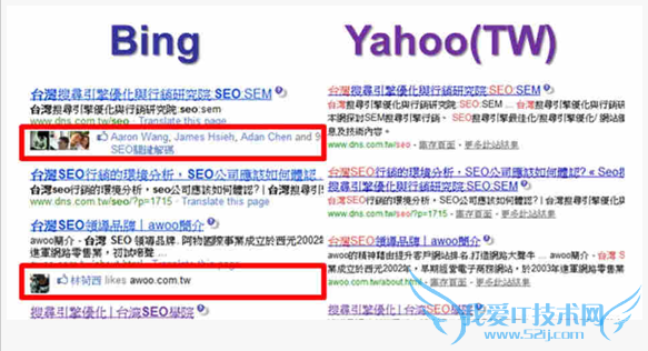 在Yahoo(台湾)表面上搜索结果并未呈现社群讯息,但是如果你用同样的关键字到bing.com 去搜索的话,你会发现排名会是一样,而且还会有社群讯息!