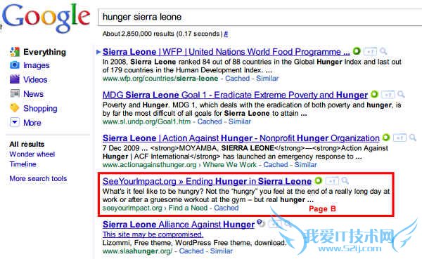 原图中范例所使用的关键字并不恰当,所以我实际使用“hunger sierra leone”在Google.com中搜索,发现依旧是Page B获得了比较好的名次。