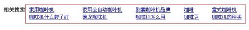 网站的优化首先就得进行关键字的分析研究,当在做一个网站的关键字分析研究之前首先就得明白所要优化网站的主题,在明白了主题之后就可以根据网站主题关键字来进行优化扩展。如:在当前笔者所优化关于销售“咖啡机”的网站,在笔者明确了该网站主要是销售咖啡机之时,笔者就会通过“咖啡机”这个主关键字来进行优化扩展,此时笔者就会通过关键字挖掘工具、站长工具、百度指数、百度下拉框以及百度相关搜索来获取。如下图所示咖啡机关键字的相关关键词: