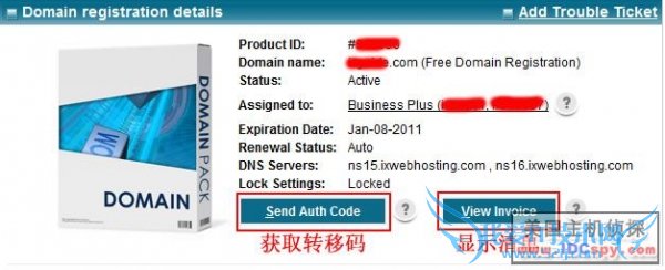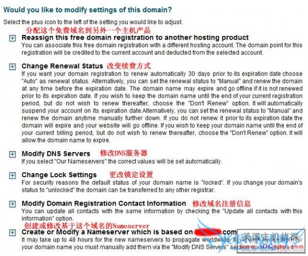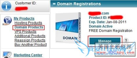 二、点击上图中左边的domain products,右边对应出现域名的产品,点击manage按钮进入其管理页面,如下图: