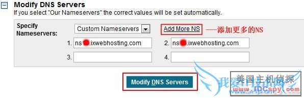 注意:如果需要更改为其的的NS服务器,那么只需要将1和2后面的更改为所需,即可如果一组服务器还不够的话,你可以添加上面的“Add More NS”,来添加一组,就会出现下面的3和4。