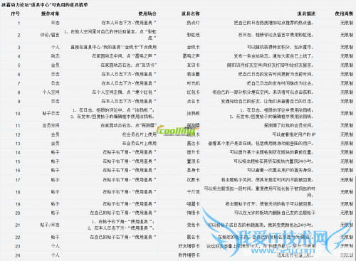 1)所有的道具均使用论坛积分的“经验值”按其价格进行购买自己使用或赠送给其他会员;道具的回收价格为定价的80%,可以允许所有能使用道具的用户组将道具退货给论坛。