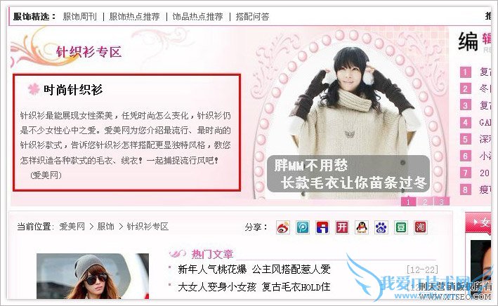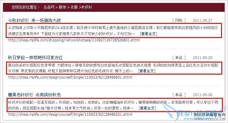 图中以红色框框出的搜索结果都是经过了内容优化的网站列表页面,分列第4、6、7、8、10位,占据了首页一半的自然排名。尤其是其中的前四个页面,即瑞丽、爱美、太平洋女性和海报时尚网的“针织衫”列表页,在内容优化上做了精心的安排。