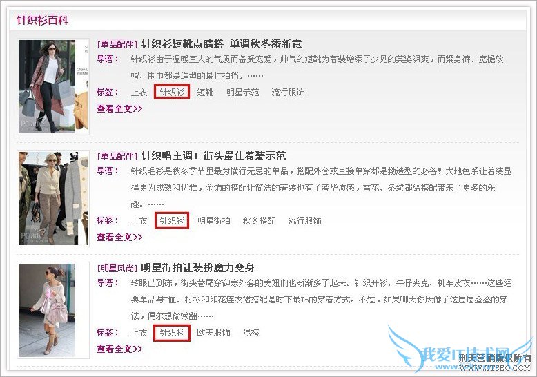 依图可见,这个站点的每篇文章都依据内容添加了4-5个标签,通过匹配标签“针织衫”,调取出相关文章页形成“针织衫”列表页。