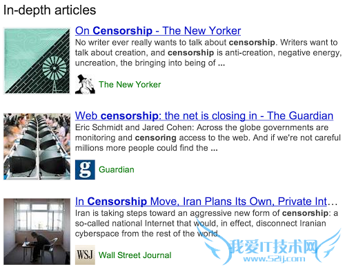 Google今天宣布了一项搜索新功能——在返回结果中新增“深度文章”部分,帮助用户更好地理解他所搜索的话题。如下图所示,现在你在英文地区 的Google中搜索“censorship”的话,Google会在返回结果中给出来自《纽约客》、《卫报》以及《华尔街日报》等老牌纸媒的深度文章链接。如果你搜索“lego”,则会发现从性别到艺术到工程等不同话题的深度文章。