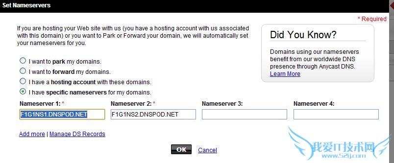 4.会弹出对话框,选中最后一个 I have specific nameservers for my domains,然后直接修改Nameserver 1: *、Nameserver 2: *为F1G1NS1.DNSPOD.NET、F1G1NS2.DNSPOD.NET,点击ok。然后一直ok下去。