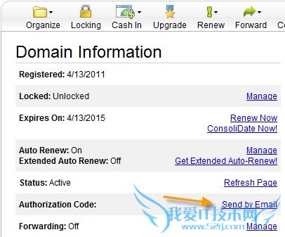现在到了Domain Details页面,在Domain Information下面倒数第二条就是Authorization Code。后面有个Send by Email链接。点击此链接,GoDaddy就会把这个EPP密码发送到你账户上设置的邮箱地址里面了。