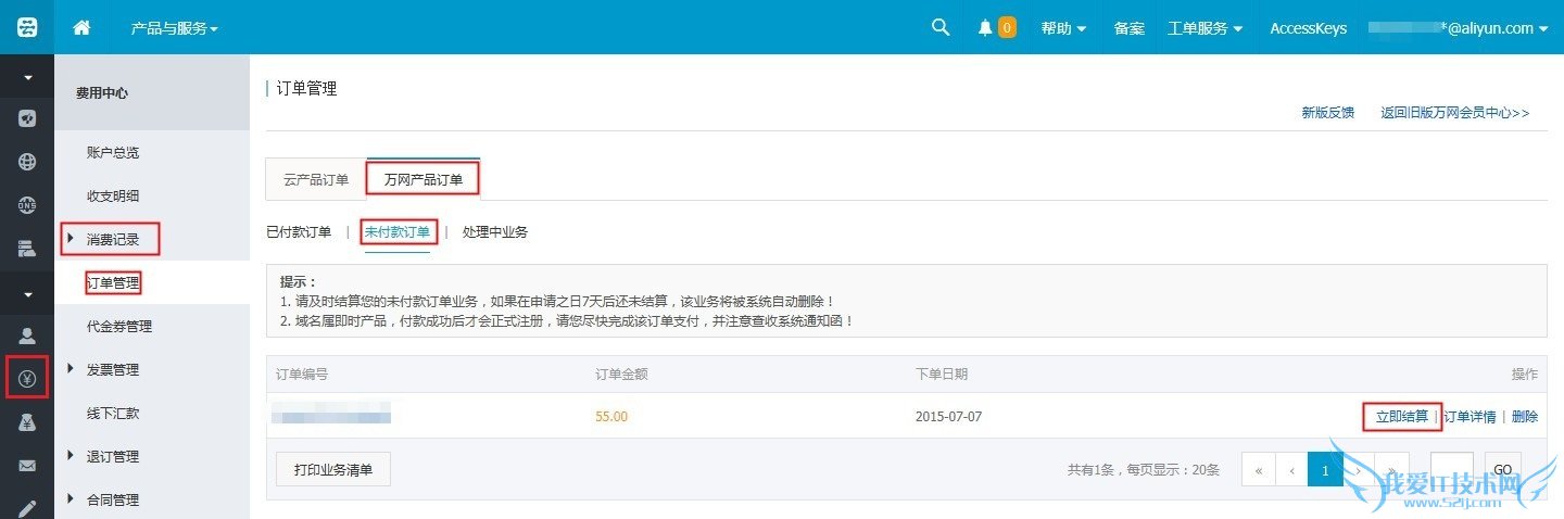 2)、若到期日有误,可进入【万网产品订单】--【未付款订单】--查看是否有未结算的订单,及时进行结算。