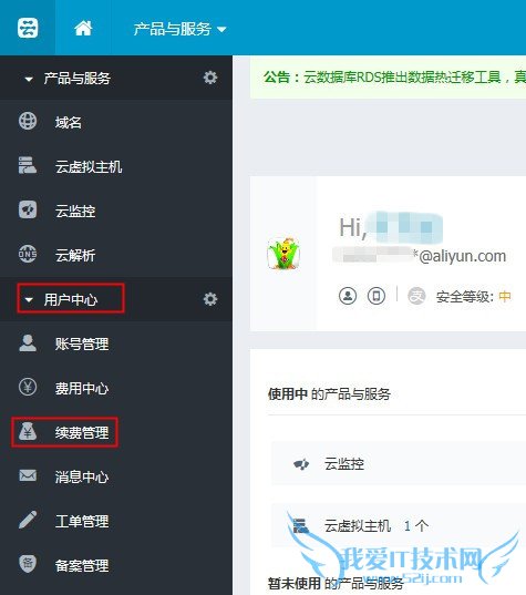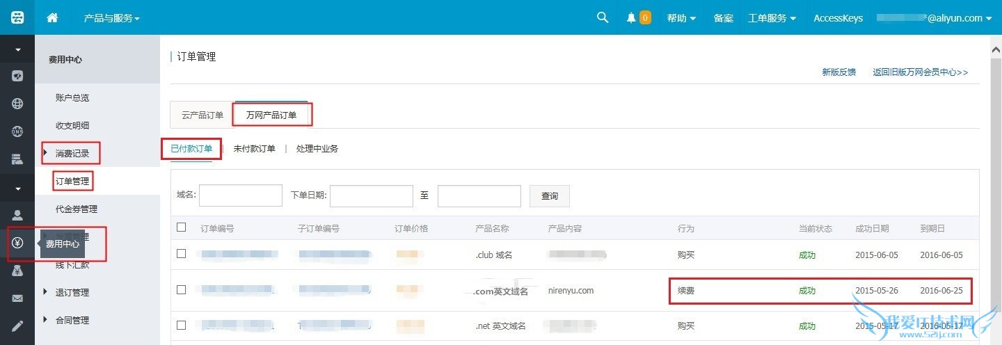 1)、登录万网/阿里云【管理控制台】--左侧【用户中心】--【费用中心】--【消费记录】--【订单管理】--选择【万网产品订单】--选择【已付款订单】--查看您所续费业务的“当前状态”和“到期日”等,确认无误即完成续费。