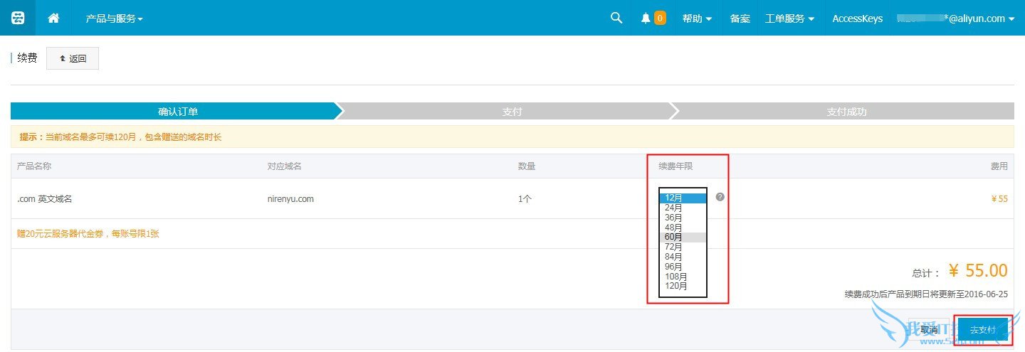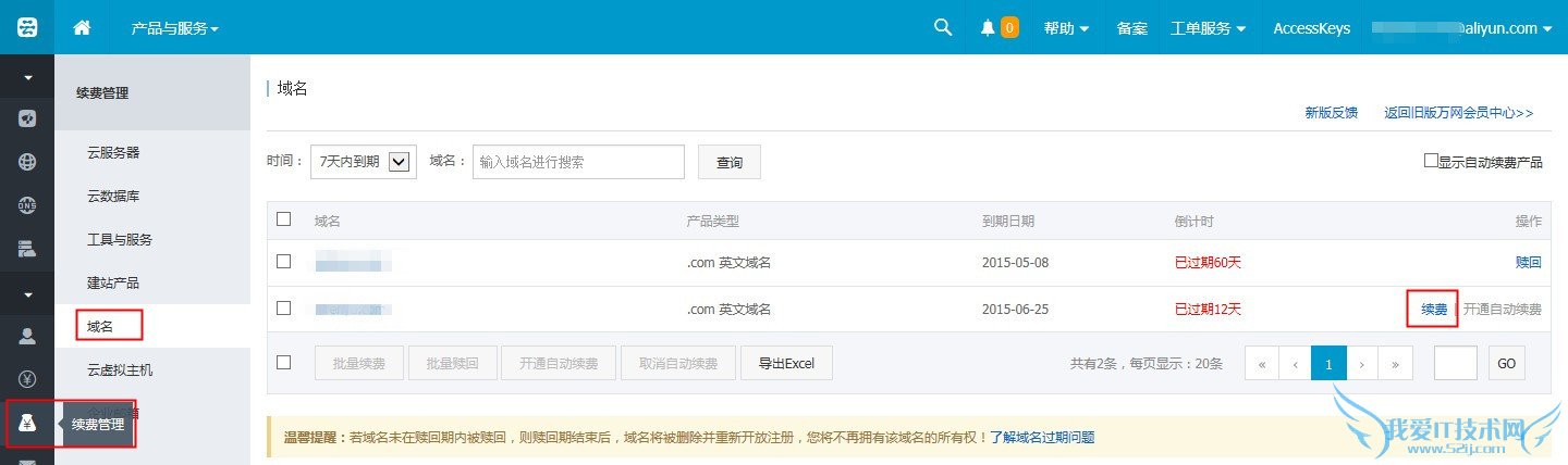 1、登录万网/阿里云【管理控制台】-【产品与服务】-【域名】-在【 急需续费域名】中,找到要续费的域名,点击【续费】(或批量勾选要续费的域名,点击【域名续费】)