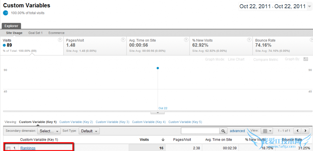 接着阐述上面的3.4点。你将在GA中的自定义变量中找到你所搜集的数据。我会展示一些截图。点击 Visitors 》 Demographics 》 Custom Variables(中文:访问者》维度》自定义变量)。如下: