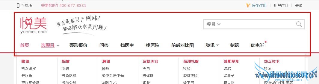 导航到底是怎么去设计,是可以根据自己的评测去进行吗?如果你根据这个去设计,我只能说你的用户会离开你。我在《网络营销策划,算个球啊》 中详细对于怎样考虑需求去进行网站营销策划大致的说明了一下。其实网站导航设计也是离不开用户的需求。怎么去做呢?你可以参考一下百度相关搜索关键词去进 行布局。比如说,整形。你到百度搜索这个关键词你会发现百度首页出现了什么。是不是出现了百度知道、医院、以及一些与整形相关的项目。出现百度知道说明用 户有问答的需求。其他两个也是我们需要去挖掘的。这样你看看悦美网的布局也就感觉是非常合理的了。