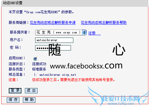 4.保存后,点击“动态DNS设置”,账号密码就是你oray的通行证,点登录,如果成功了,就会自动识别你的免费域名。如图所示,然后保存就行了。