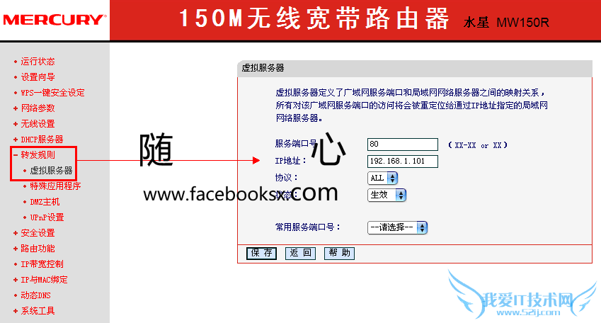 3.使用oray护照,登录花生壳,系统会自动分配给你一个免费域名,用这个域名来访问手机。登录你的路由器,点击“转发规则”,选择“虚拟服务器”,端口填写80,IP地址填写你手机WIFI的IP地址,保存,如图所示。