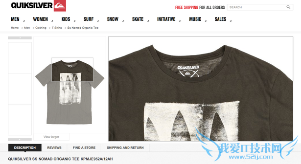 照片是产品的脸面,具有吸引力的产品图像对销售有正面的作用并且能够减少退货率。而反面就是低质量,低分辨率的照片则让你的网站看起来非常不专业并给用户留下负面的印象。Quiksilver使用的产品图像能够让用户将鼠标移到图片上面时自动缩放。
