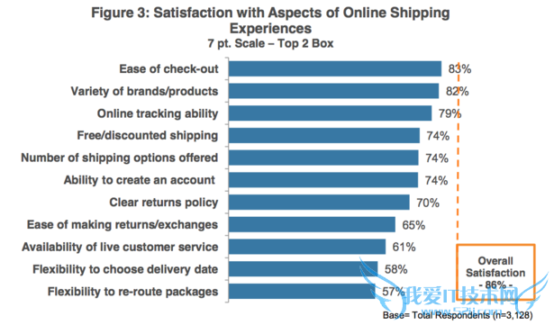 来自 comScore的调研发现,在电商网站的各个方面中,满意度比较低的方面多跟配送和退货有关。