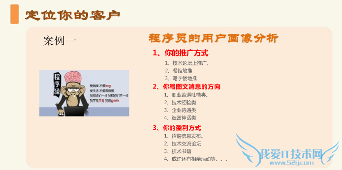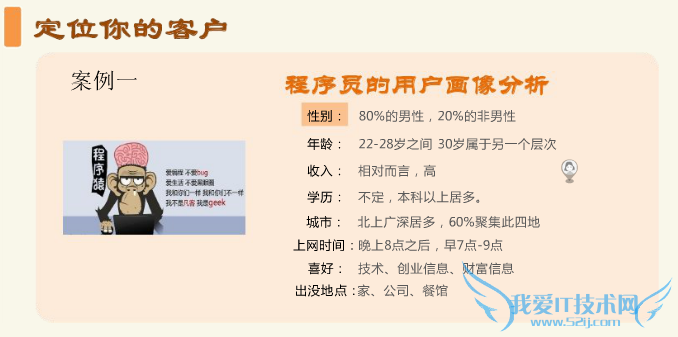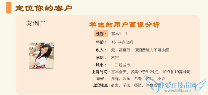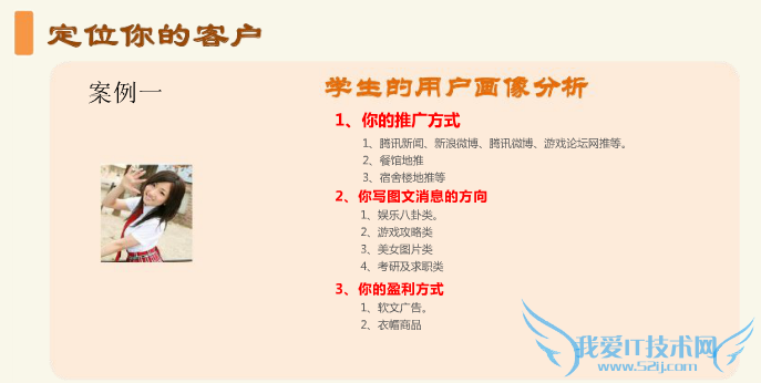 清晰的用户画像有助于你后期推广方法展开,还有你写图文信息的方向,最后还关联到的盈利模式。当然这是后面篇幅要展开讨论的问题,这里只根据上述两个用户画像,做下分析: