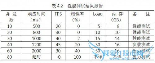测试结果报告应能够反映上述性能测试曲线的规律,阅读者可以得到系统性能是否满足设计目标和业务要求、系统最大负载能力、系统最大压力承受能力等重要信息,表4.2是一个简单示例。