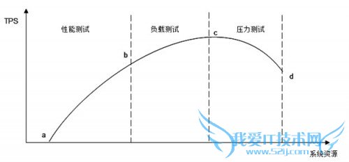 图4.3中的横坐标表示消耗的系统资源,纵坐标表示系统处理能力(吞吐量)。在开始阶段,随着并发请求数目的增加,系统使用较少的资源就达到较好的处理能力(a~b段),这一段是网站的日常运行区间,网站的绝大部分访问负载压力都集中在这一段区间,被称作性能测试,测试目标是评估系统性能是否符合需求及设计目标;随着压力的持续增加,系统处理能力增加变缓,直到达到一个最大值(c点),这是系统的最大负载点,这一段被称作负载测试。测试目标是评估当系统因为突发事件超出日常访问压力的情况下,保证系统正常运行情况下能够承受的最大访问负载压力;超过这个点后,再增加压力,系统的处理能力反而下降,而资源消耗却更多,直到资源消耗达到极限(d点),这个点可以看作是系统的崩溃点,超过这个点继续加大并发请求数目,系统不能再处理任何请求,这一段被称作压力测试,测试目标是评估可能导致系统崩溃的最大访问负载压力。