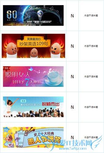 列出10张广告图片,请被调查的用户为每张图片填写愿否点击(Y/N)及原因,