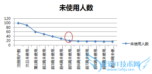 2, 自然流失率:以上图为例,当天注册用户100个,其中有20个在此后五周完全没有使用行为,则该日的注册用户自然流失率为20/100=20%;