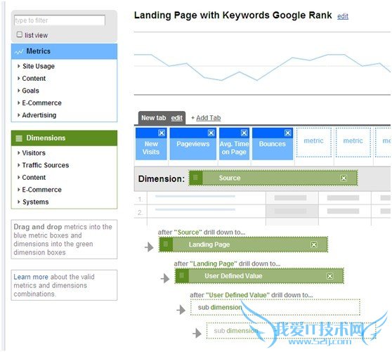 6.为你的报表创建一个名字,然后从左边的指标和维度列表中拖动我们所需要的模块,到自定义报表上,设置如图。