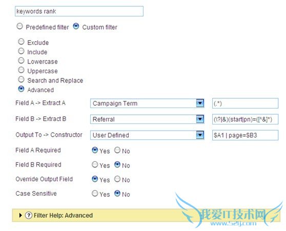 3.为你创建的过滤器设置个名字,然后选择”custom filter”,然后在下面选择”Advanced”,下面的下拉菜单设置如图,3个需要填写的表单分别为。