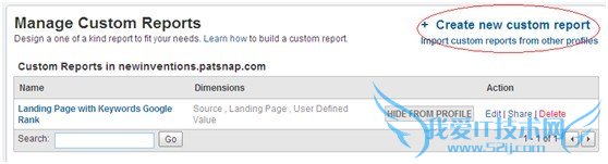 5.打开你网站的报表,左侧有一个Custom Reporting-自定义报告,打开Manage Custom Reports,创建一个新的自定义报告。