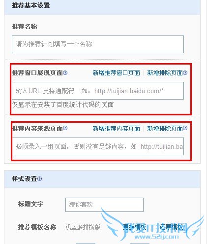 3、推荐详细设置。这里一共分为三个部分:推荐基本设置、样式设置和效果预览区。这一步也很简单,照着填就行了,注意一点,推荐窗口展现页面和推荐内容来源页面支持通配符,baidu.com/*,但是如果只想展现一部分页面和来源页也可以利用新增推荐页面和新增排除页面。