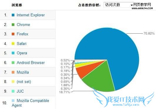 这条数据通常告诉我们应如何设计网页,从图中可以看出浏览器中IE占多半比例,Firefox和Chrome的用户量也比较大。因此设计或改版时,需要重点满足IE用户的需求,同时要保证网页在IE、Firefox和Chrome下的兼容性。www.aishen99.com