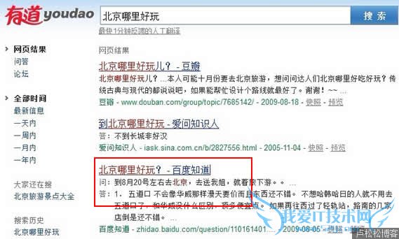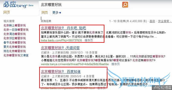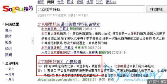尽管通过soso搜“北京哪里好玩”百度知道网址并没有进入前三,但也排在第六位。由于篇幅所限,卢松松就不截图了,有兴趣的朋友可以用各大搜索引擎搜下。