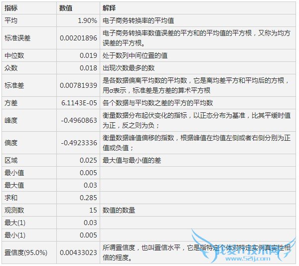 举个例子:根据过去15天的电子商务转化率,想要得到它的数据分布区间、标准差、峰值和极差等描述统计指标。一般来说,电子商务网站的转换率在3%以下,转换率指的是订单除以访问数,注意不是除以pv,因为对于某些外贸站,访问深度可能比较深,每即次访问可能有》 10的pv,所以用pv来做电子商务的转换率不合适。