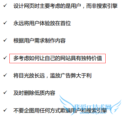 百度也提示了,要提供独特的价值,它的意思是让你Think different。世界上没有两片完全相同的树叶,也不应该有两个完全相同的网站。独有的,应该包括稀缺的内容、独有的语言风格、独有的内容形式、独有的网站形象等等,种种独有综合起来,不走寻常路,才能让别人记住你进而黏住你。