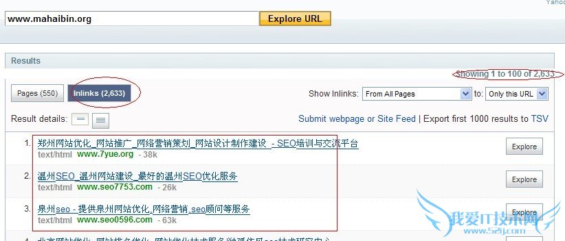 2天前的早上,一个seo朋友也是偶的客户突然打我电话说,他的站点雅虎外链查询不到了。等我回公司上网查询看了,发现以前查询雅虎外链的页面改版了,如下图