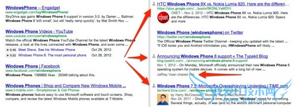 我先关掉了个人化,并搜索了Windows Phone,然后打开个人化,进行了同样的搜索。结果如下:(左边的是没有个人化的结果,右边的是个人化的)