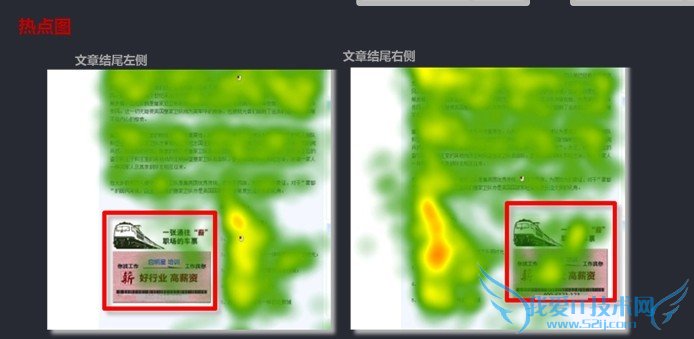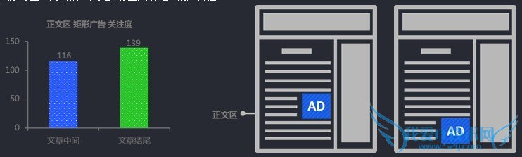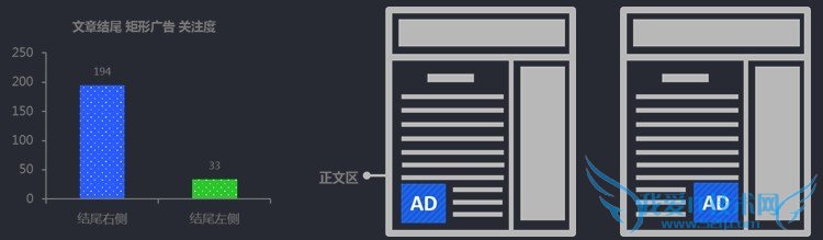 Ⅱ:另外,鉴于矩形广告本身尺寸的特殊性,在文章结尾处,广告又可放置于左侧与右侧,那么哪一侧广告的关注度更高呢?实验发现,右侧结尾的广告关注度远好于左侧结尾的广告关注度。