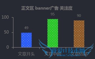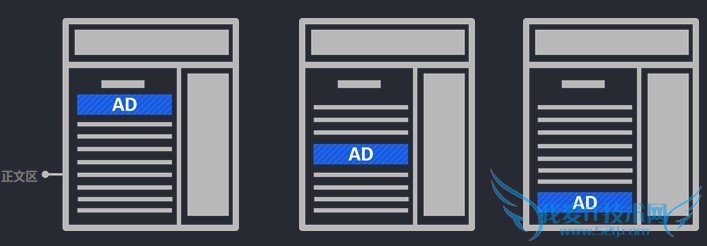 正文区内横幅广告可以放置于上中下3个位置,如图所示,经实验发现,正文中间与正文结尾的横幅广告关注度最高: