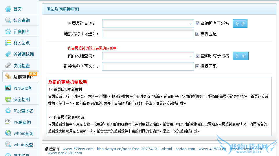 通过两个图进行对比,最大的区别就是新版本的内容更多了,主要是增加了一个“内页反链查询”而这个就是最大的亮点。现在常做的外链就2种,第1种是首页高质量外链,爱站老版本就主要是满足大家对首页反链的分析。第2种就是内页描文本链接,这是一般反链查询工具容易忽视的,但却又是现在常见的一种外链增加渠道。
