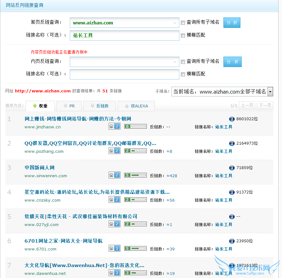首页反链的查询,有更多的筛选排序条件,默认的是按百度权重排序。同时也可以根据大家的需求按“PR”“反链数”“alexa排名”来进行排序。从而能更快速的了解一个网站外链情况。