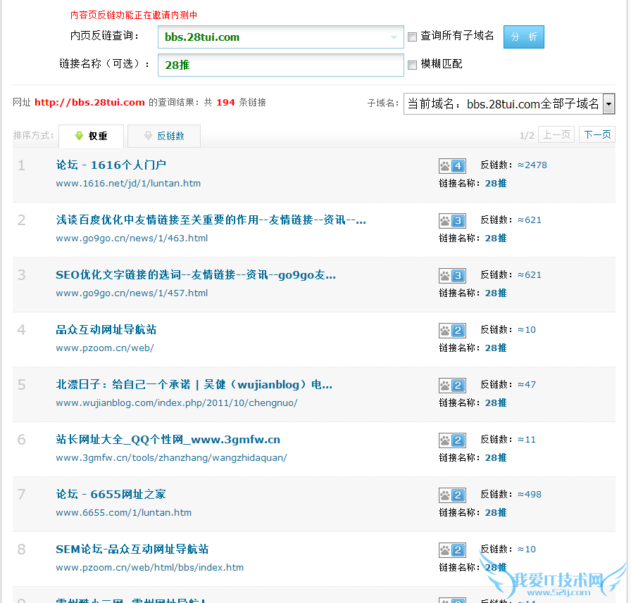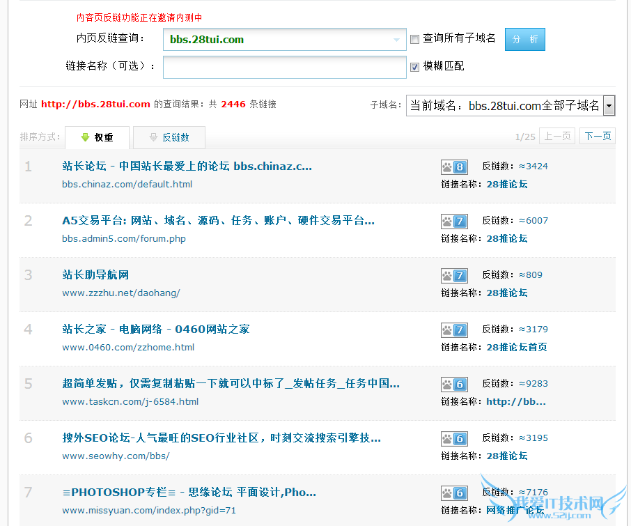 如图:查询bbs.28tui.com 有多少内页链接(勾选的模糊匹配)