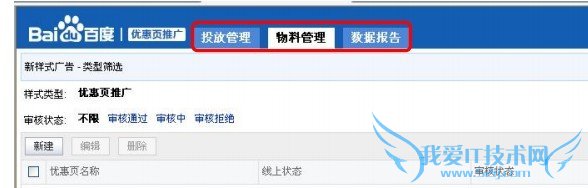 进入平台后,我们会发现“优惠页推广”管理平台包括“投放管理”“物料管理”“数据报告”三部分。通过投放管理,我们可以了解到每个单元中投放的优惠页情况,我们要新建优惠页就要在物料管理中操作,数据报告顾名思义我们可以看到想要的统计数据报表。