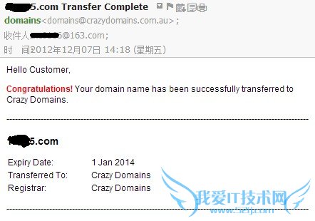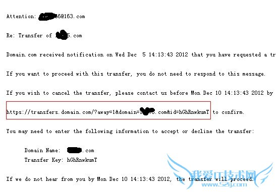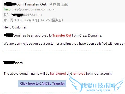 经过检查邮箱发现,在域名转移成功提示邮件的7分钟后,crazydomains由发来一份题为 *****.com Transfer Out的邮件。意思是我准许域名转移,如需取消转移请点击链接。