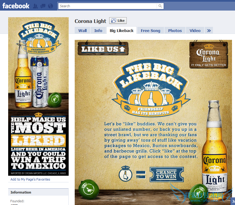去年Corona Light跨媒体营销活动中一个重要目标是成为“美国最受欢迎的淡啤”。整个营销活动中最值得一提的就是他们发动了Facebook 粉丝将自己照片刊登在纽约时代广场的Corona Light的广告牌上。这次的社交媒体上的互动营销进行的十分成功。粉丝们不仅积极参与了主页上的互动,也纷纷口耳相传这个千载难逢的登上时代广场广告牌 的机会。Corona Light的广告牌在纽约时代广场上放置了一个月(到12月底)。许多粉丝都得到了这个难得的机会,而他们也成了这次以Facebook为基点的广告推广 活动的一部分。