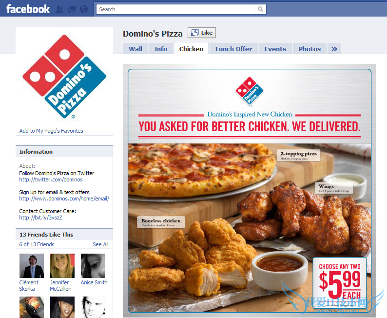 Domino的比萨通过其今年的广告活动已经完全重塑了品牌形象。他们将宣传重心转移到了社交网络上与用户的互动。当他们意识到他们以前的比萨 尝起来象纸板的时候,他们在Facebook主页上增加了一个‘Tab’。粉丝们可以在这个Tab里控诉对这个著名连锁的所有抱怨和不满。先不说他们比萨 的味道到底有没有进步,开始倾听粉丝的意见已经是一个非常有效的改善品牌形象恶化的方式。直到现在,Domino都非常活跃的在它的页面上更新状态和回复 粉丝留言。