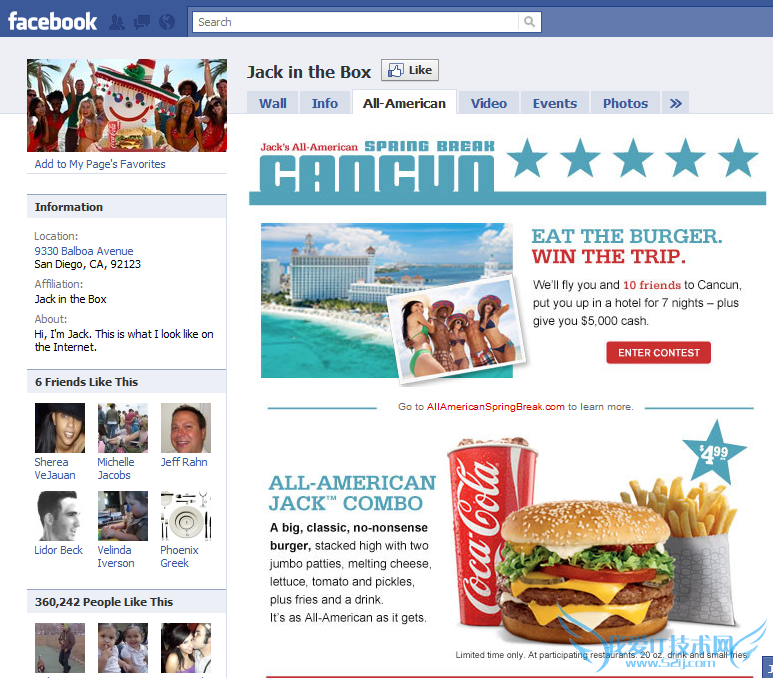 著名的快餐连锁店Jack In The Box举办的十月富裕粉丝大抽奖中,每当Facebook主页增加一个新的粉丝,他们令人有点毛骨悚然的吉祥物‘Jack’ 就会在一个虚拟的存钱罐里存入5分美元。他们以2000美元为起存点。当一个月后奖金发放给中奖的粉丝的时候,存钱罐里的金额达到了11,500美元。不 用说,在社交网络上免费派钱是是最有效也是最容易获得新粉丝的方法。这个营销活动不仅十分的有创意,也成功的让快餐连锁店的支持人数爆增。